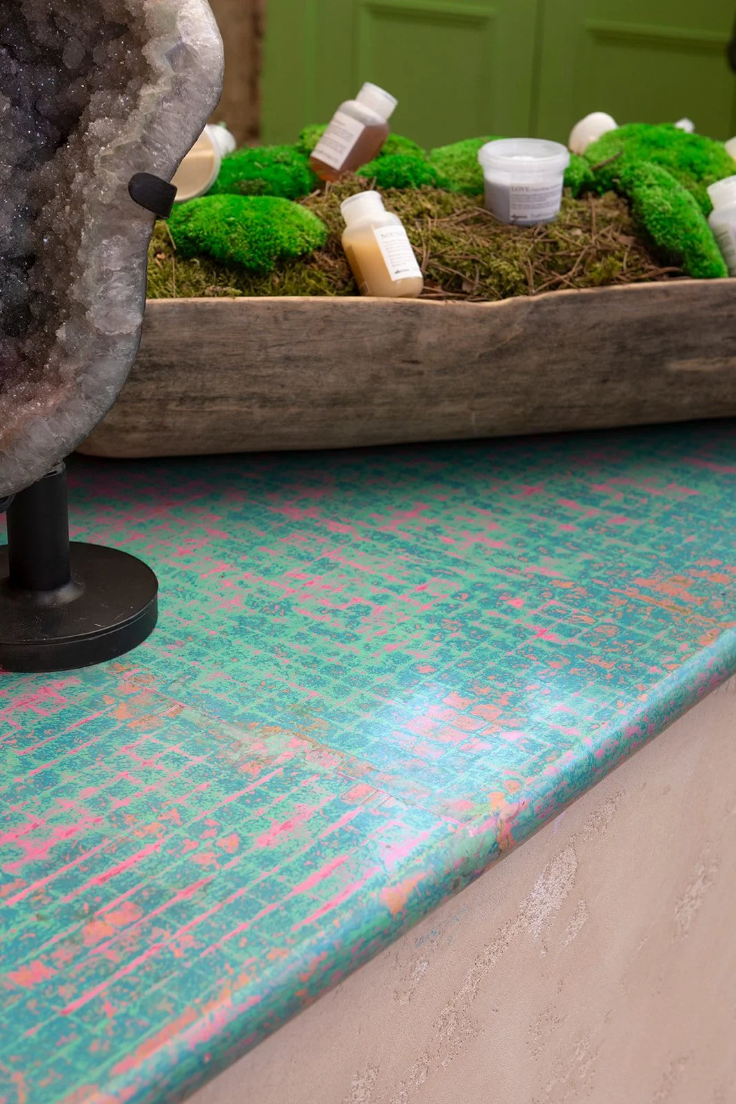 Splintr designed, fabricated and fitted numerous items around the space, including the entirely patinated brass clad colouring area, the chunky oak cutting stations, the wavy oak retail shelving, the cosy and eccentric basement WC’s and the microcement reception counter, and much more!