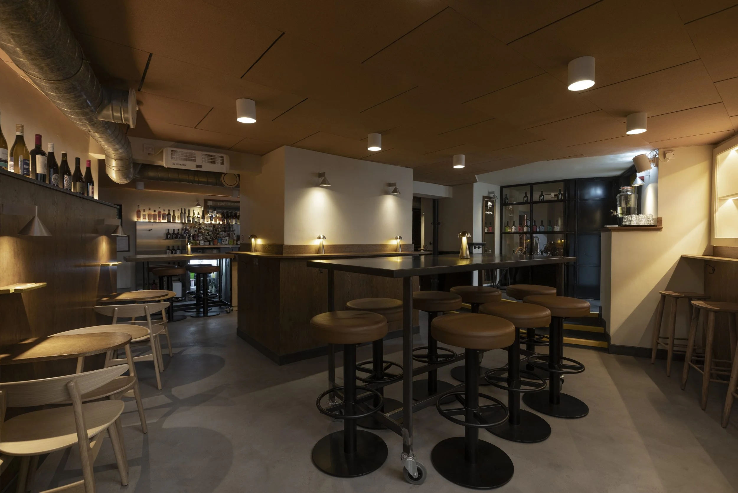 Splintr designed and partially fitted out the cosy new Calton Road bar, Folly. Working closely with the client — who also operates the iconic corner pub above, formerly The Black Bull — we transformed a well-worn city-centre venue into a warm, contemporary wine and spirits bar. The material palette combines yellow Valchromat, solid oak, raw mild steel, stainless steel, and cork, creating a space that feels both modern and inviting while retaining a sense of character and durability.