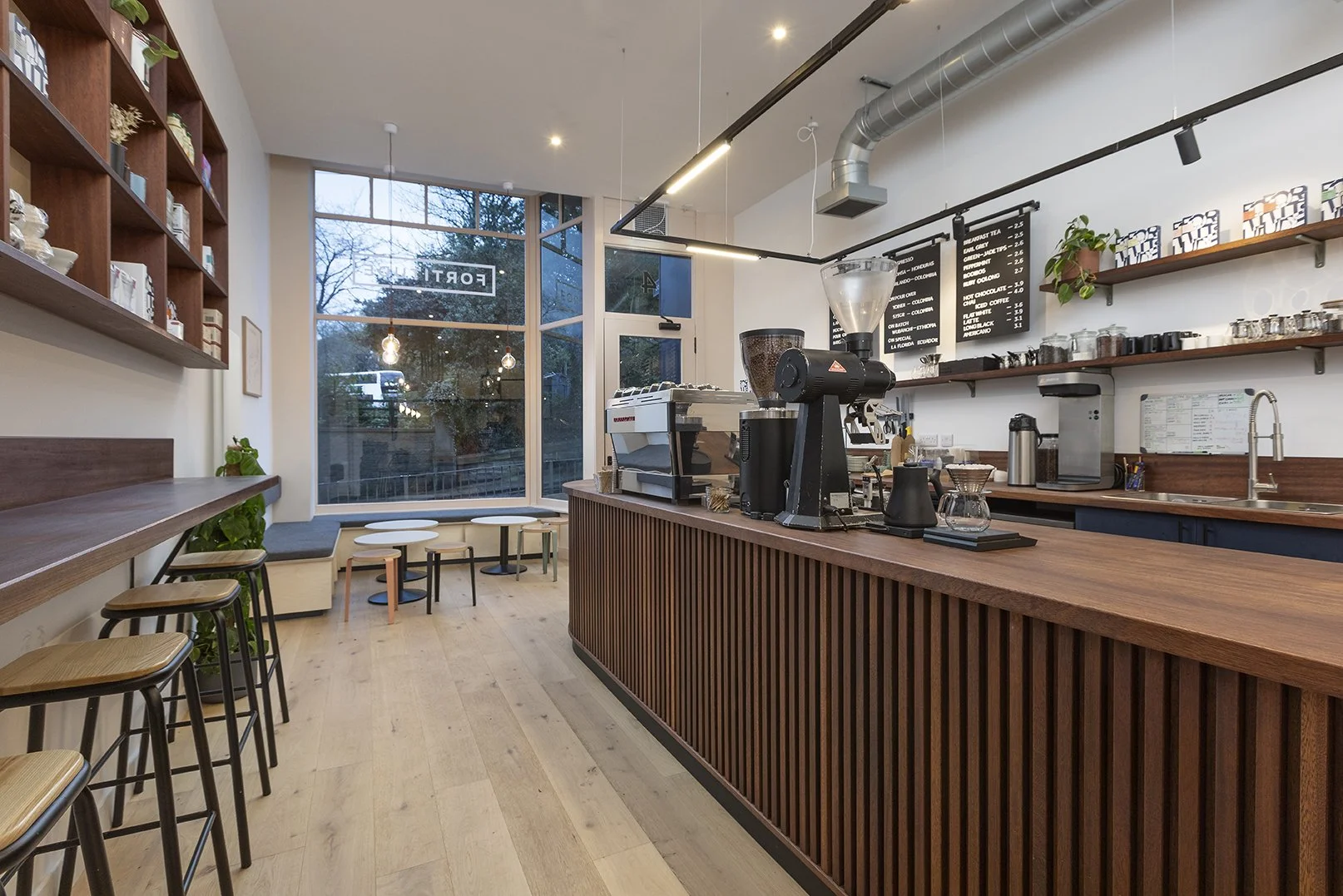 In the latter part of 2023, we collaborated once again with Fortitude Coffee, for the third time. We were asked to design and fit their brand new premises located in the vibrant Abbeyhill area of Edinburgh. Opting to shut their original city centre coffee shop, Fortitude Coffee expressed a desire to repurpose some of the meticulously crafted Iroko hardwood elements salvaged from their previous location. In response, we seamlessly integrated these reclaimed items into the design, complementing them with newly fashioned pieces from the same hardwood. Notably, a striking, slatted coffee bar takes center stage in the layout.