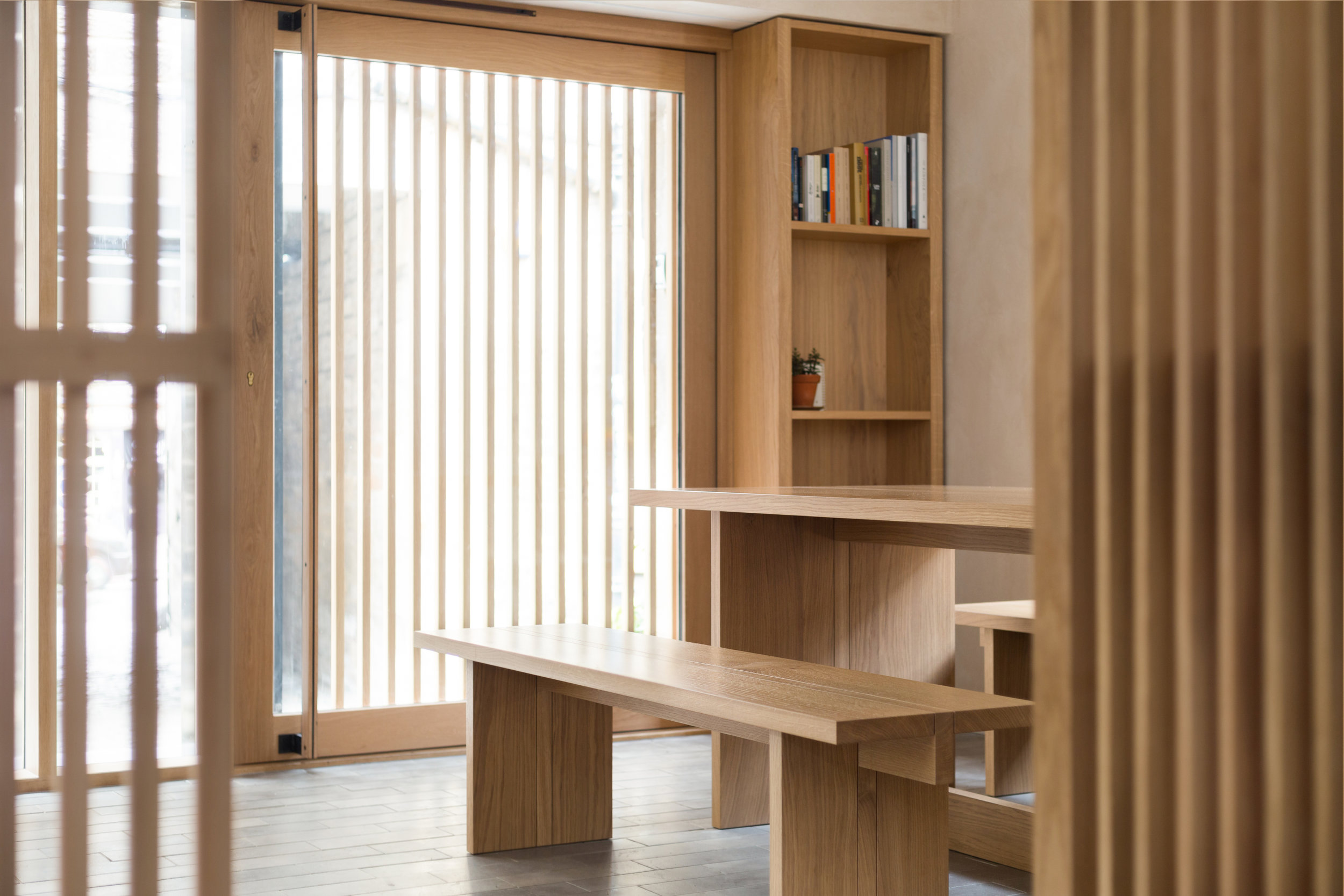 "The studio is designed as a quiet retreat for two people to rest after a busy day exploring the city. The design of the space includes an open kitchen and living area, a bedroom with double bed and separate shower room. Porteous’ Studio is constructed from natural products which create warm, peaceful and tactile interior. The natural clay plaster walls regulate humidity levels to the optimum human comfort range and create a calm atmosphere and the velvet limestone tiles sit softly with the cobbles outside and the underfloor heating keep feet cosy at all times. The furniture has been crafted from a single oak tree from East Lothian and sits with presence in the space.