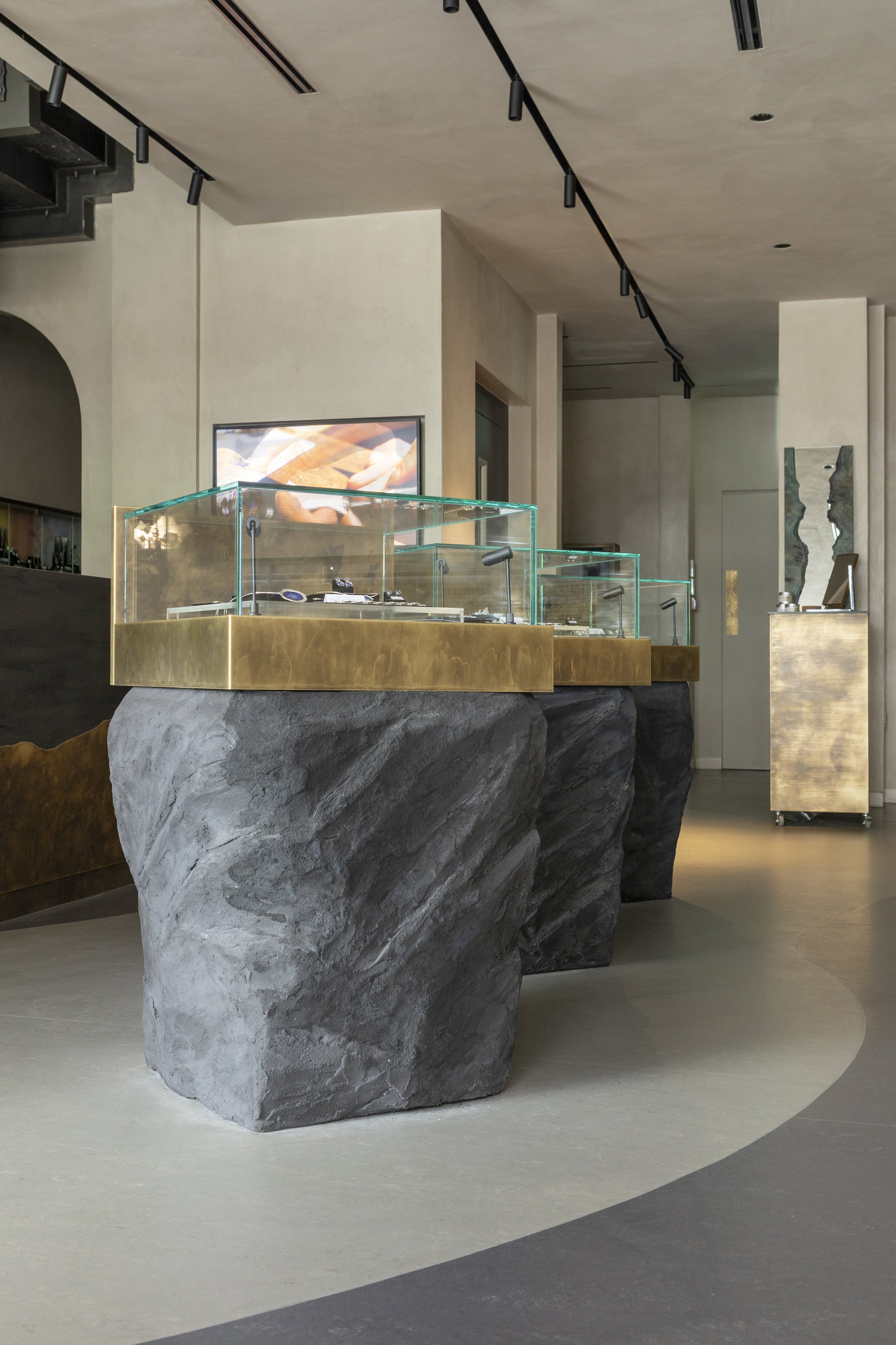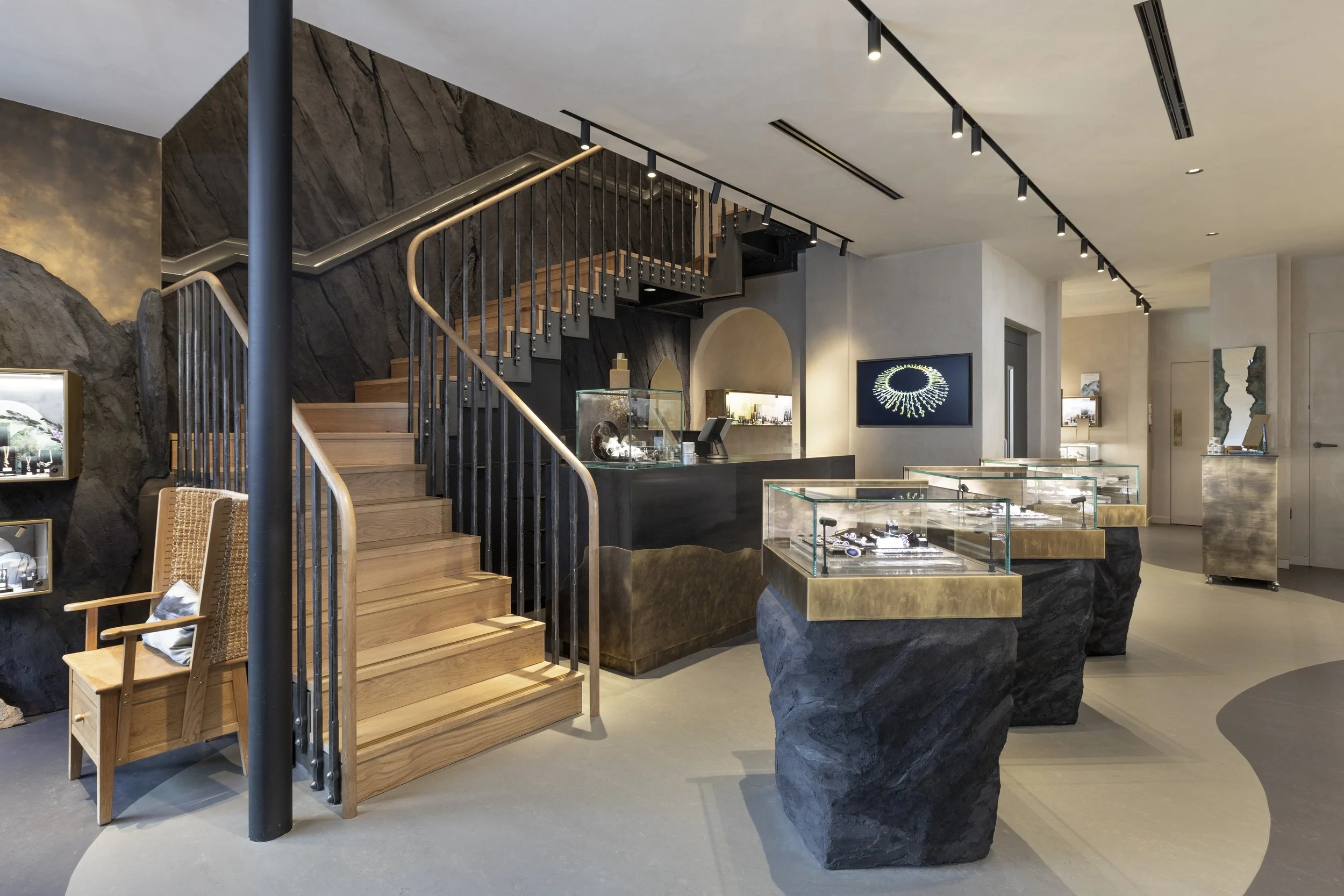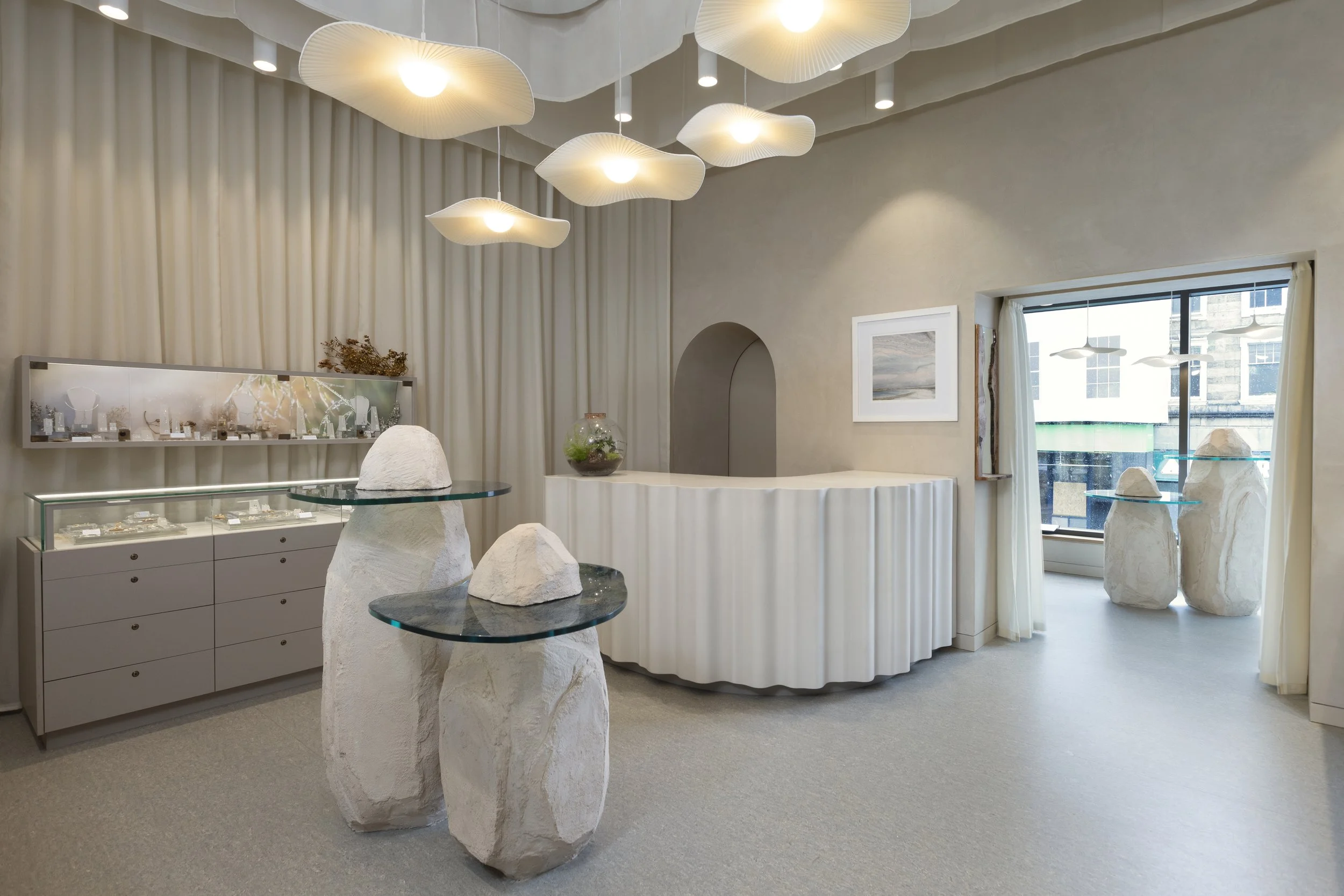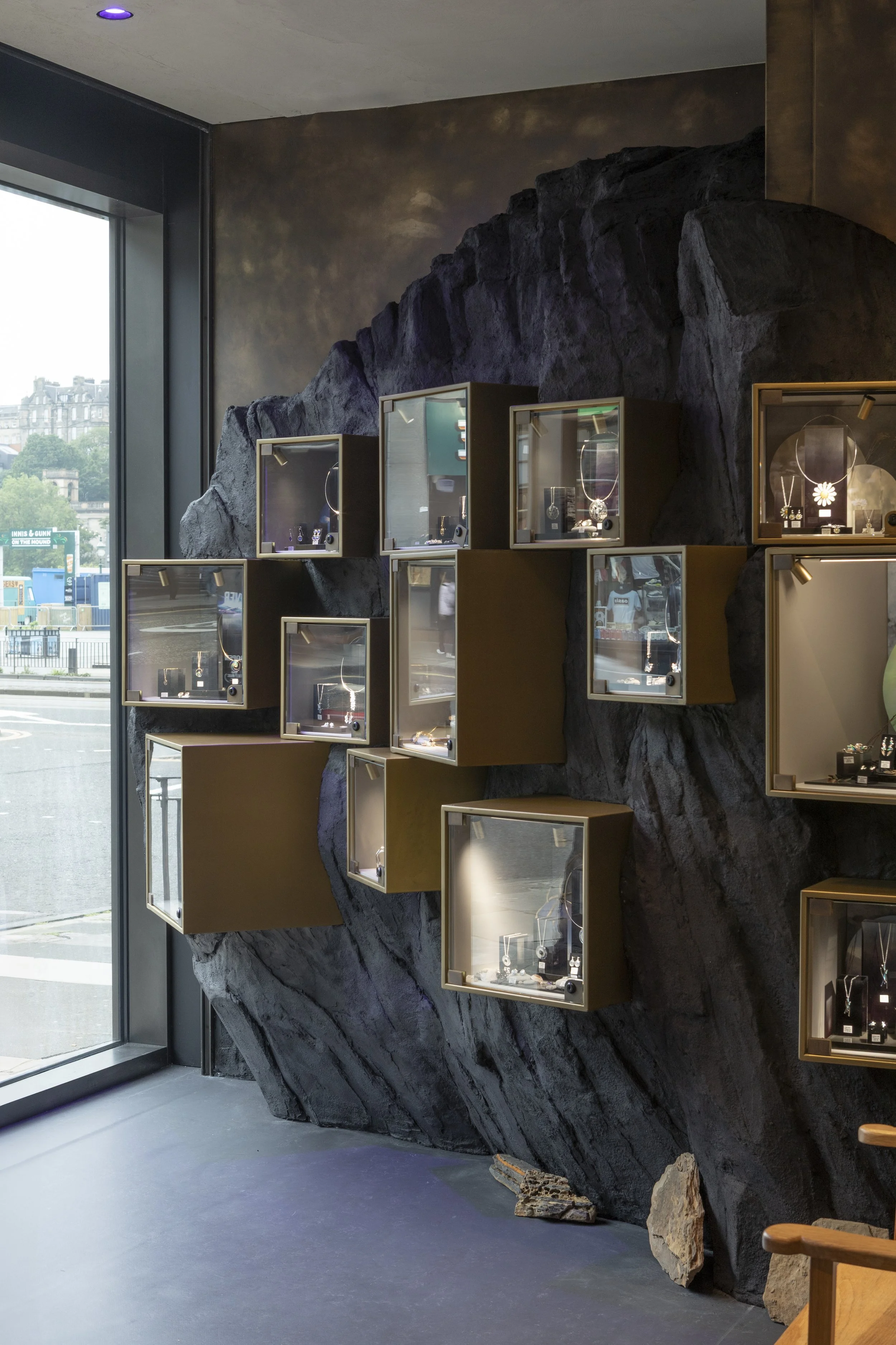 A year later, the new space has opened — a serene and ethereal environment inspired by the dramatic landscapes of Scotland. The interior consists of many bespoke jewellery cabinets, striking artificial rock walls, a custom staircase and lift, and a meticulously programmed lighting system. Sculptural furniture and a striking palette of materials complete a space that is immersive, tactile, and unmistakably connected to Sheila Fleet’s roots in Orkney’s natural beauty.