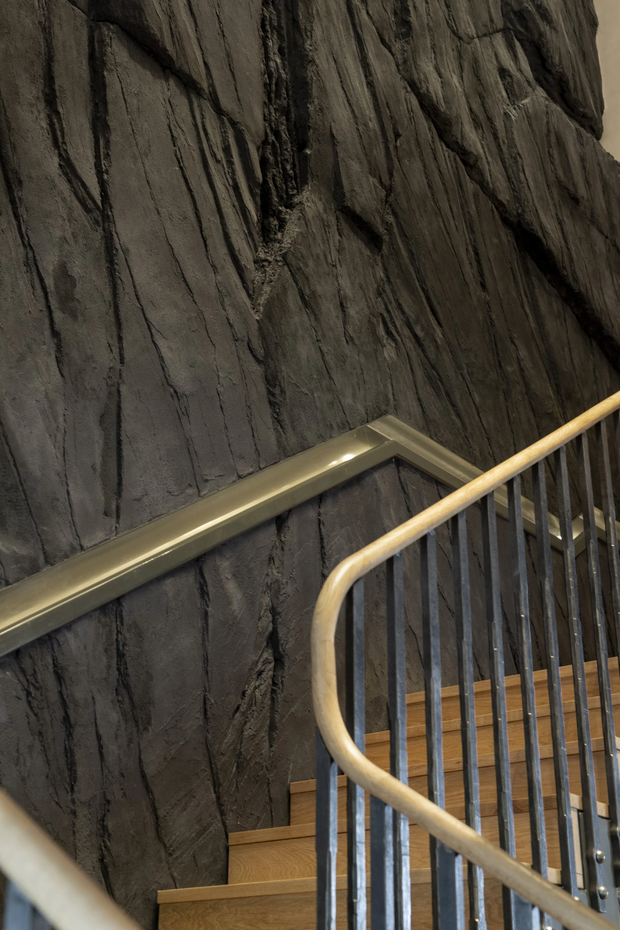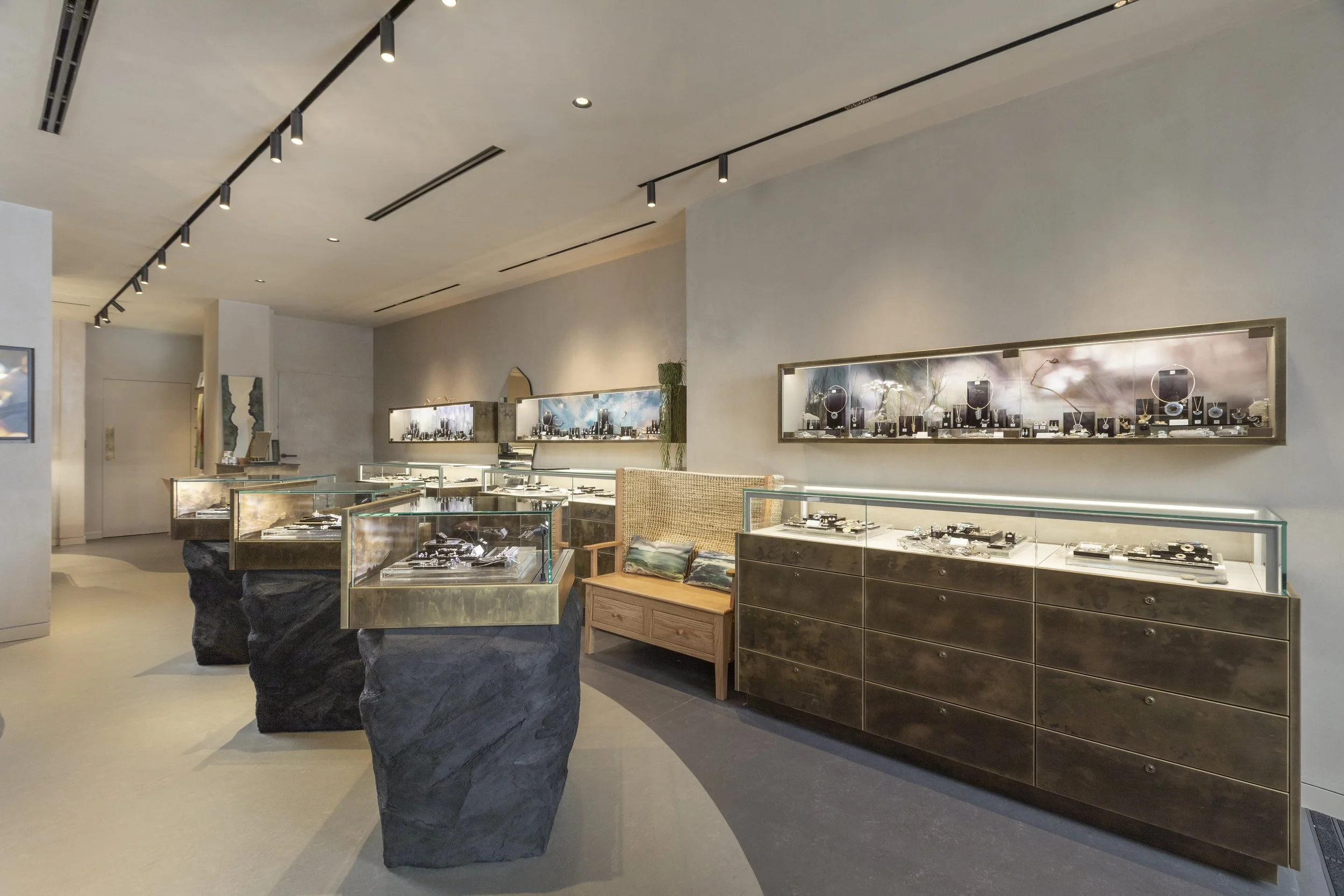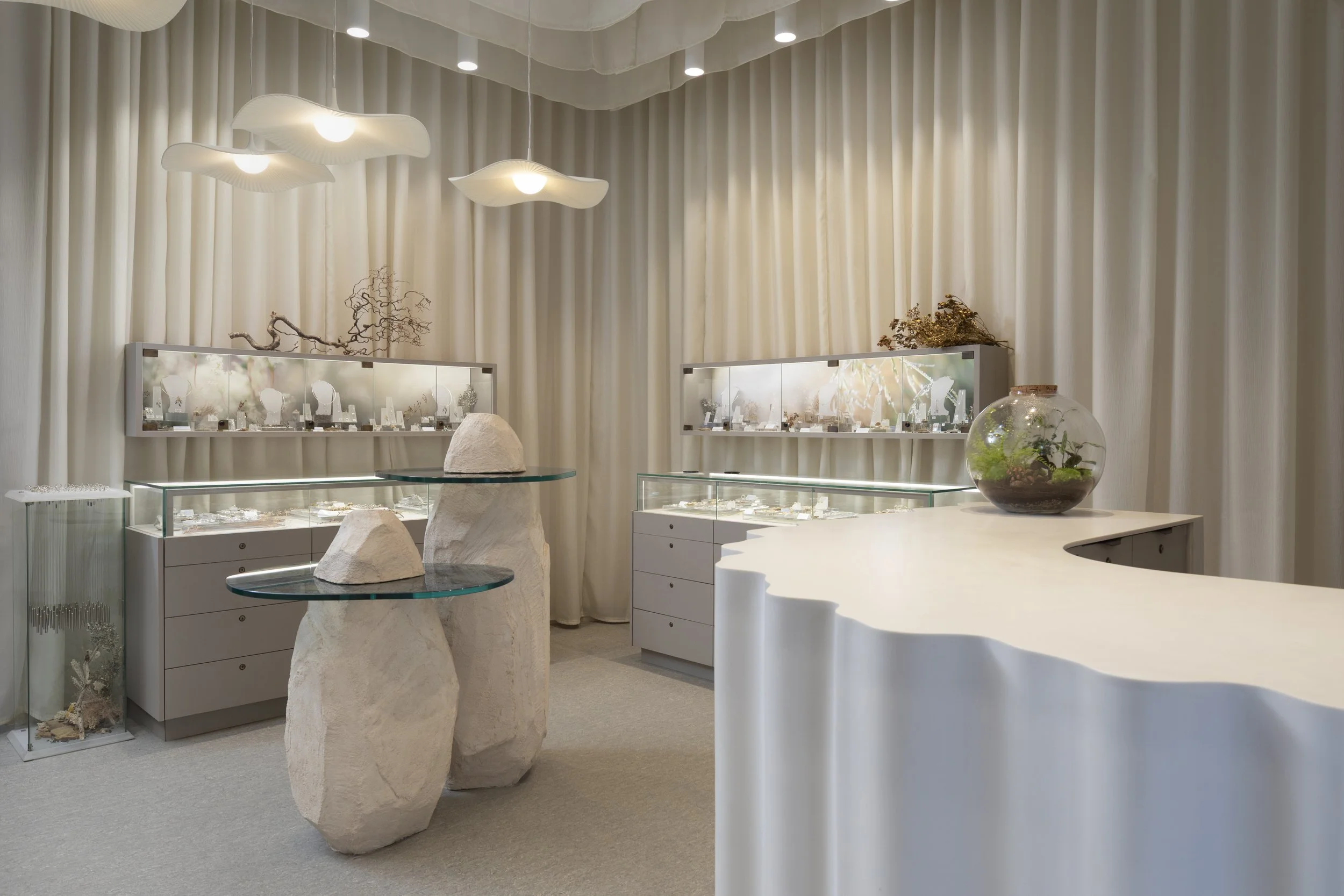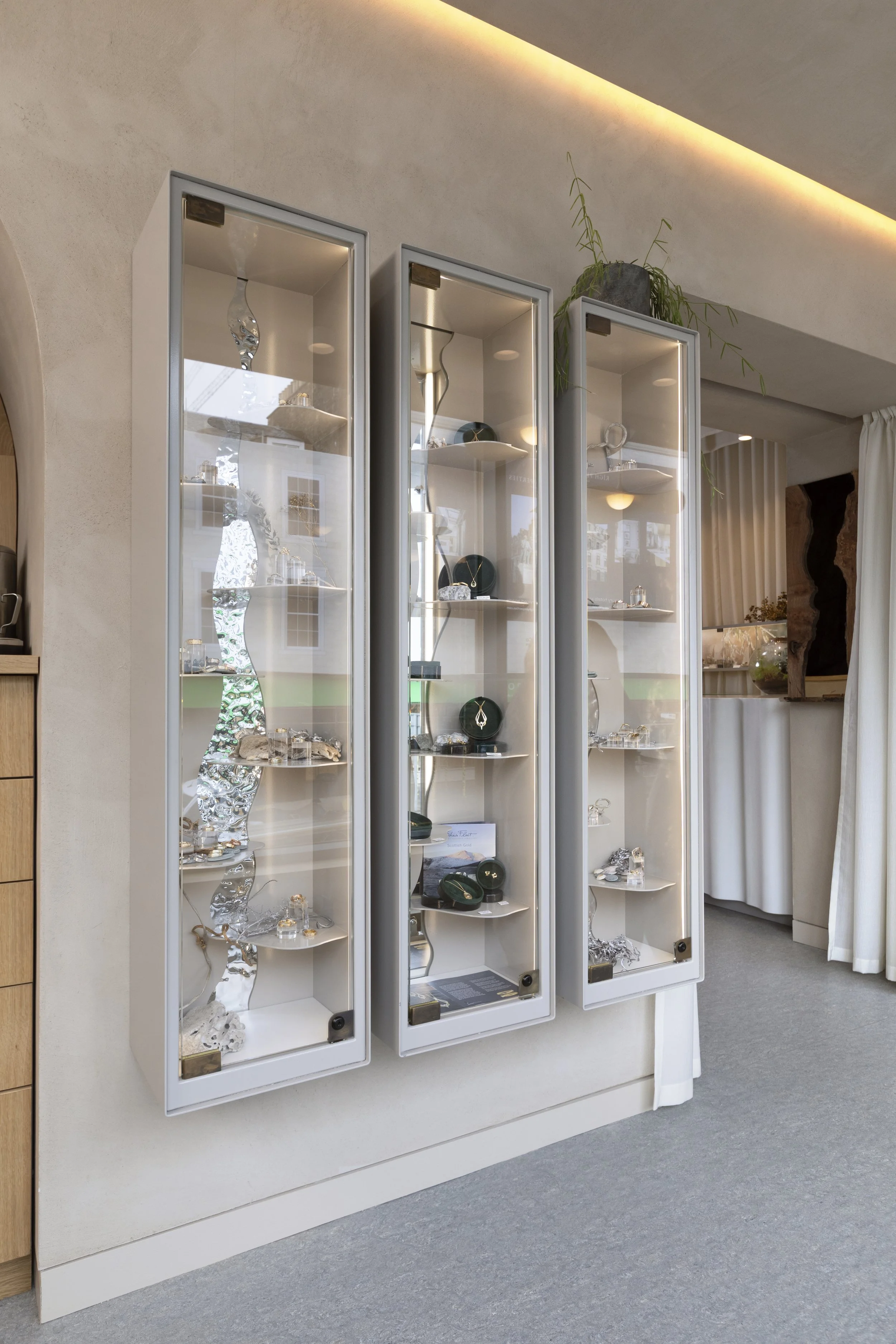 A year later, the new space has opened — a serene and ethereal environment inspired by the dramatic landscapes of Scotland. The interior consists of many bespoke jewellery cabinets, striking artificial rock walls, a custom staircase and lift, and a meticulously programmed lighting system. Sculptural furniture and a striking palette of materials complete a space that is immersive, tactile, and unmistakably connected to Sheila Fleet’s roots in Orkney’s natural beauty.